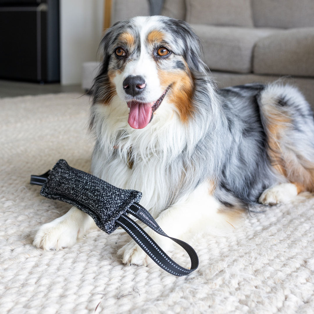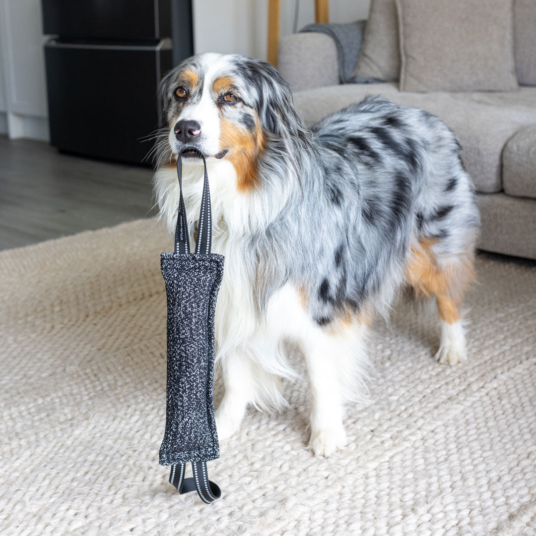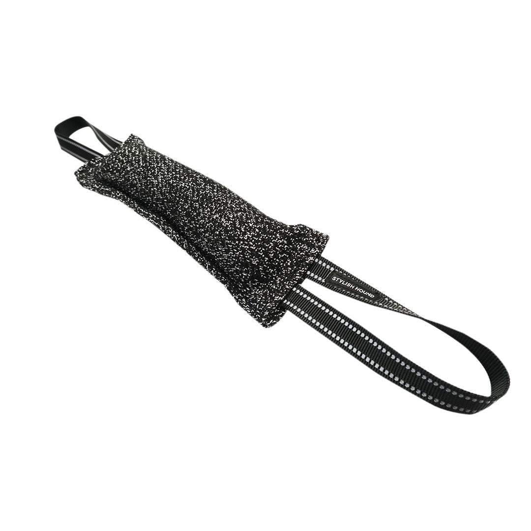 Introducing the Black Duo Tug – a double-sided tug toy designed for engaging tug-of-war, whether with you or another dog. Crafted from soft materials, it guarantees ideal indoor entertainment.